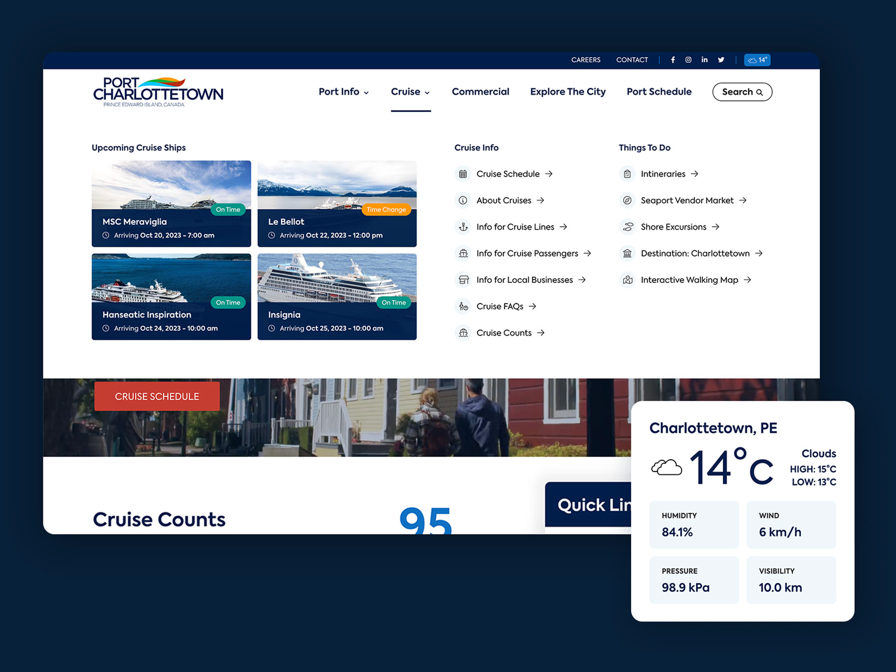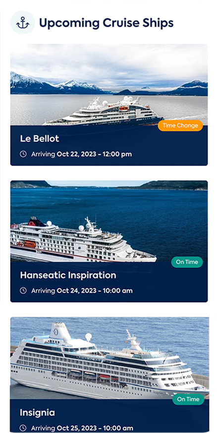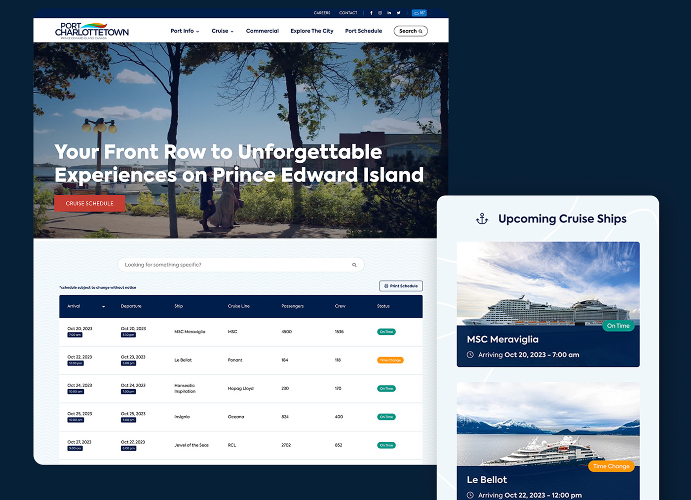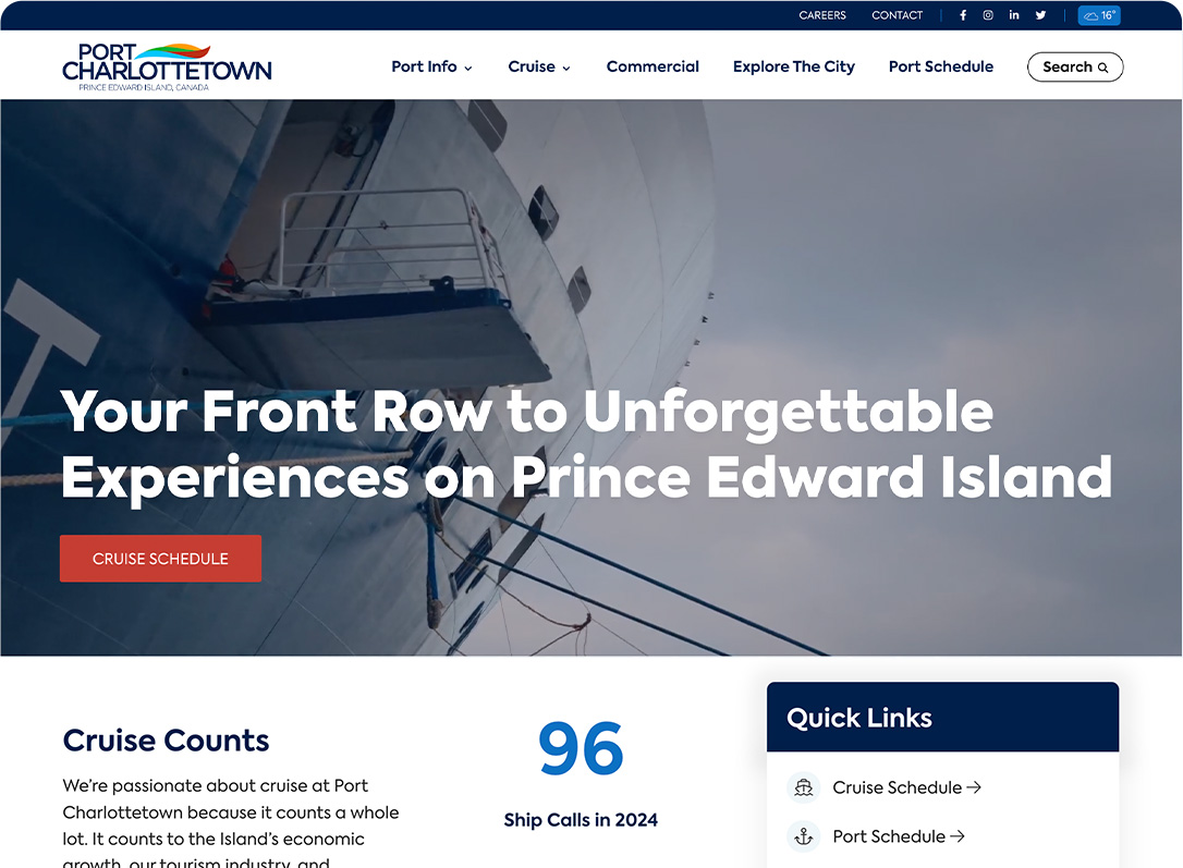 A pivotal feature of the Port Charlottetown’s website overhaul was the integration of a dynamic port and cruise schedule. Designed with both visitors and maritime professionals in mind, this interactive schedule provides instant access to crucial information in a modern, visual interface streamlining the experience for all stakeholders, all while being very easy to manage by the team at the Port.